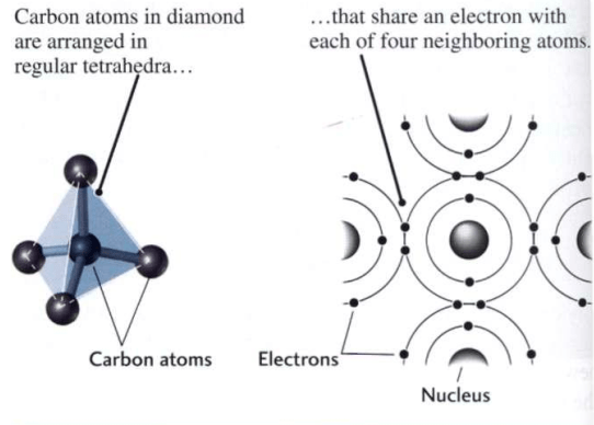 Es así que con esto nos podemos preguntar ¿y cómo se forman estas sustancias sólidas?, pues bien los minerales se llegan a formar por el proceso conocido como cristalización, el cual es un proceso en donde los átomos de un gas o líquido se unen en las proporciones químicas y la disposición cristalina adecuadas (recordemos que los átomos en un mineral se encuentran acomodados en un arreglo ordenado tridimensional). Un ejemplo de esto, es la formación del diamante, en donde los átomos de carbono se une en tetraedros (cómo lo observamos en la siguiente imagen), cada tetraedro se une a otro y construyen una estructura tridimensional regular a partir de una gran cantidad de átomos. A medida que un cristal de diamante crece, extiende su estructura tetraédrica en todas direcciones, siempre agregando nuevos átomos en la disposición geométrica adecuada.